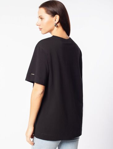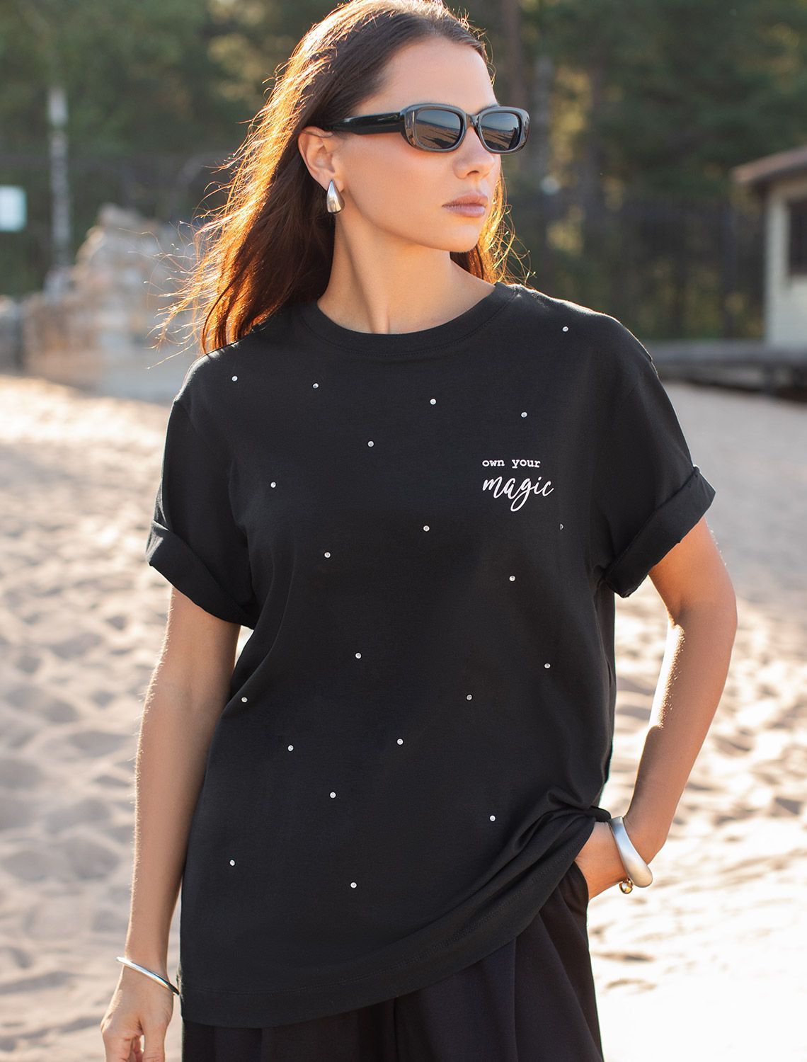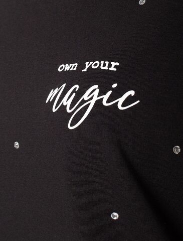 Футболка свободного кроя выполнена из премиального хлопка. Лаконичный принт нанесен красками с устойчивым покрытием и россыпью сияющих страз. Перевод: «Own your magic - Твори свою магию» Наличие эластана в составе гарантирует абсолютный комфорт и долговечность изделия. Модель дополнена металлическим логотипом бренда.