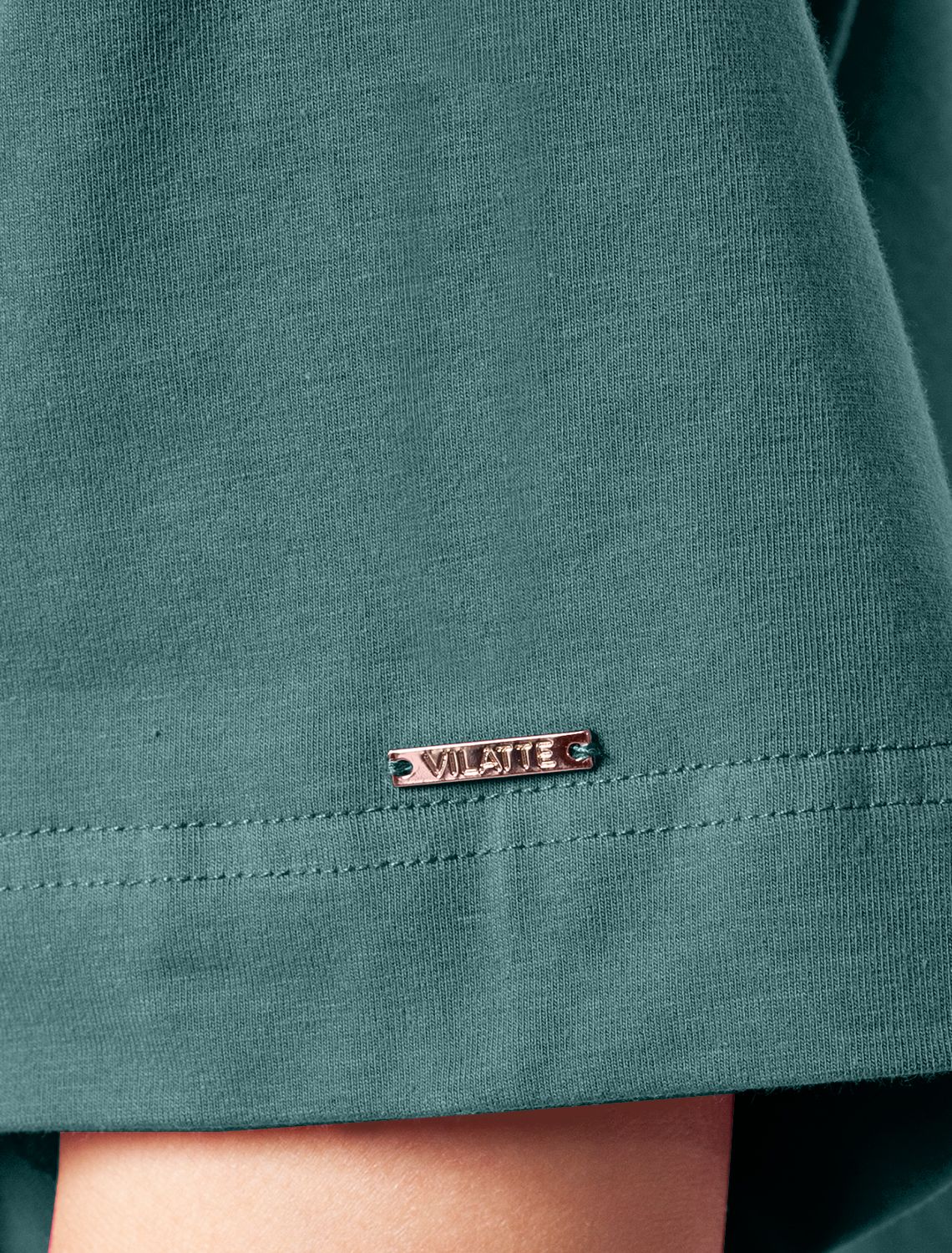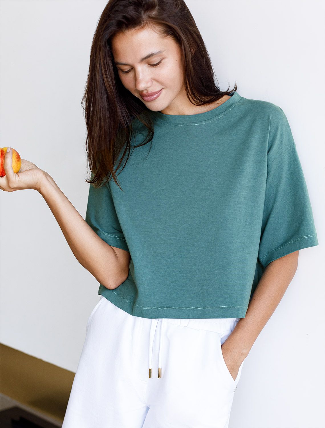 Укороченная футболка силуэта over-size сшита из премиального хлопка. Трендовый укороченный силуэт и базовая любимая вещь, которую можно носить не один сезон. Круглая горловина выполнена из эластичной рибаны. Ткань содержит небольшое количество эластана, за счет чего слегка тянется и не сковывает движения. На рукаве фирменный металлический логотип бренда. Сочетайте с брюками и юбками с высокой посадкой. Идеально на выпуск в жаркие дни.