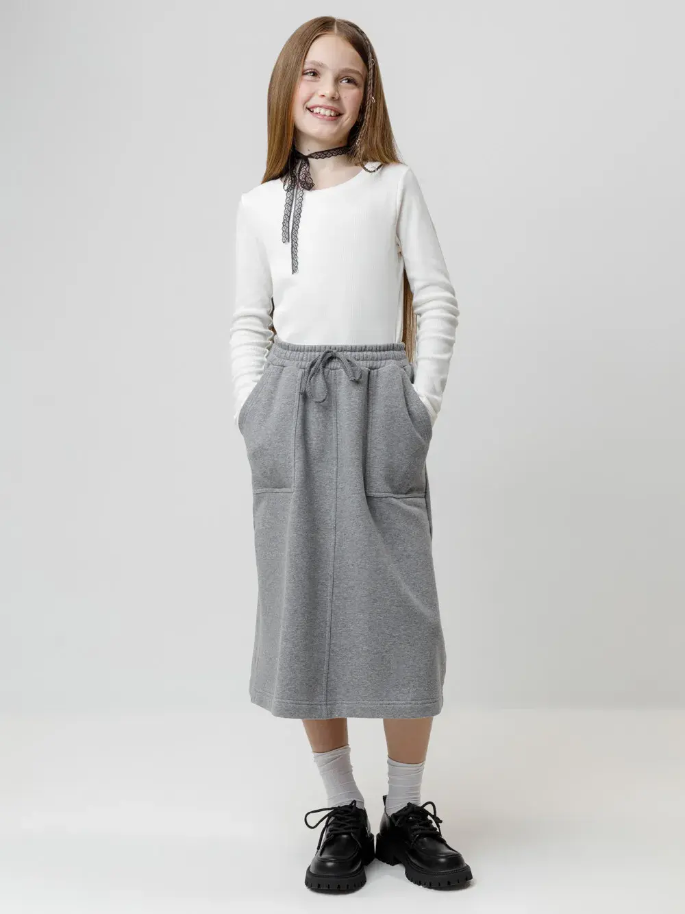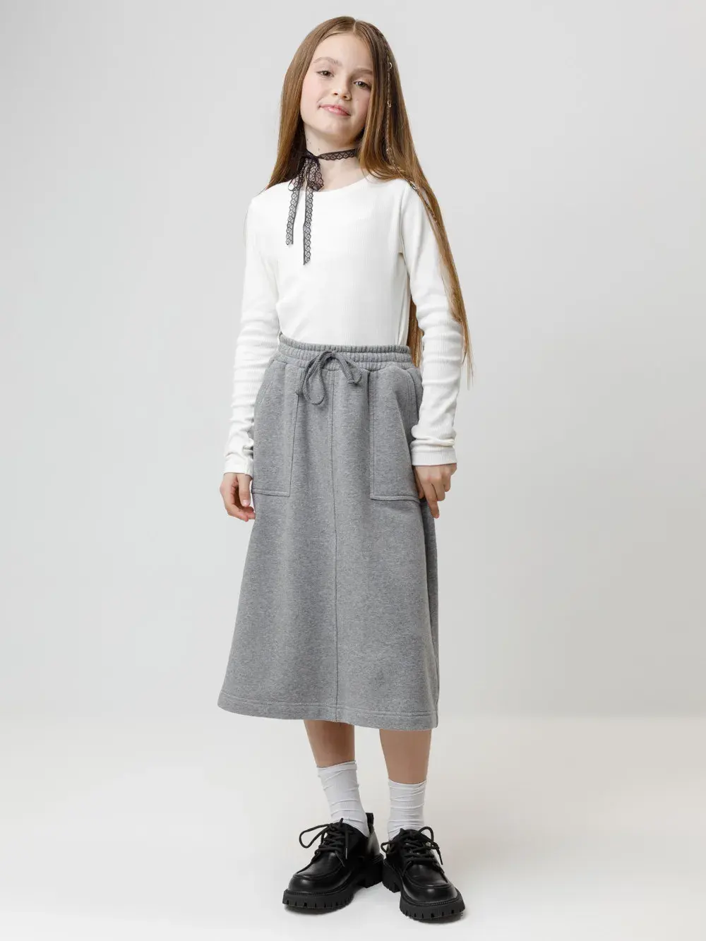 Юбка для девочки из мягкого петельчатого трикотажа. В составе 80% натурального хлопка и 20% полиэстера, при этом полиэстер ввязан внутрь по особой технологии и не соприкасается с кожей. Эластичный пояс на резинке регулируется по ширине с помощью шнурка. По бокам два удобных кармана. Изделие сохраняет цвет и форму после многократных стирок. Все трикотажные полотна производятся в соответствии с нормами швейцарского сертификата ЭкоТекс.