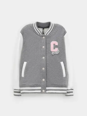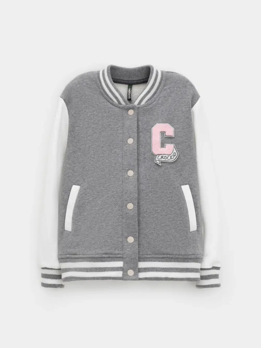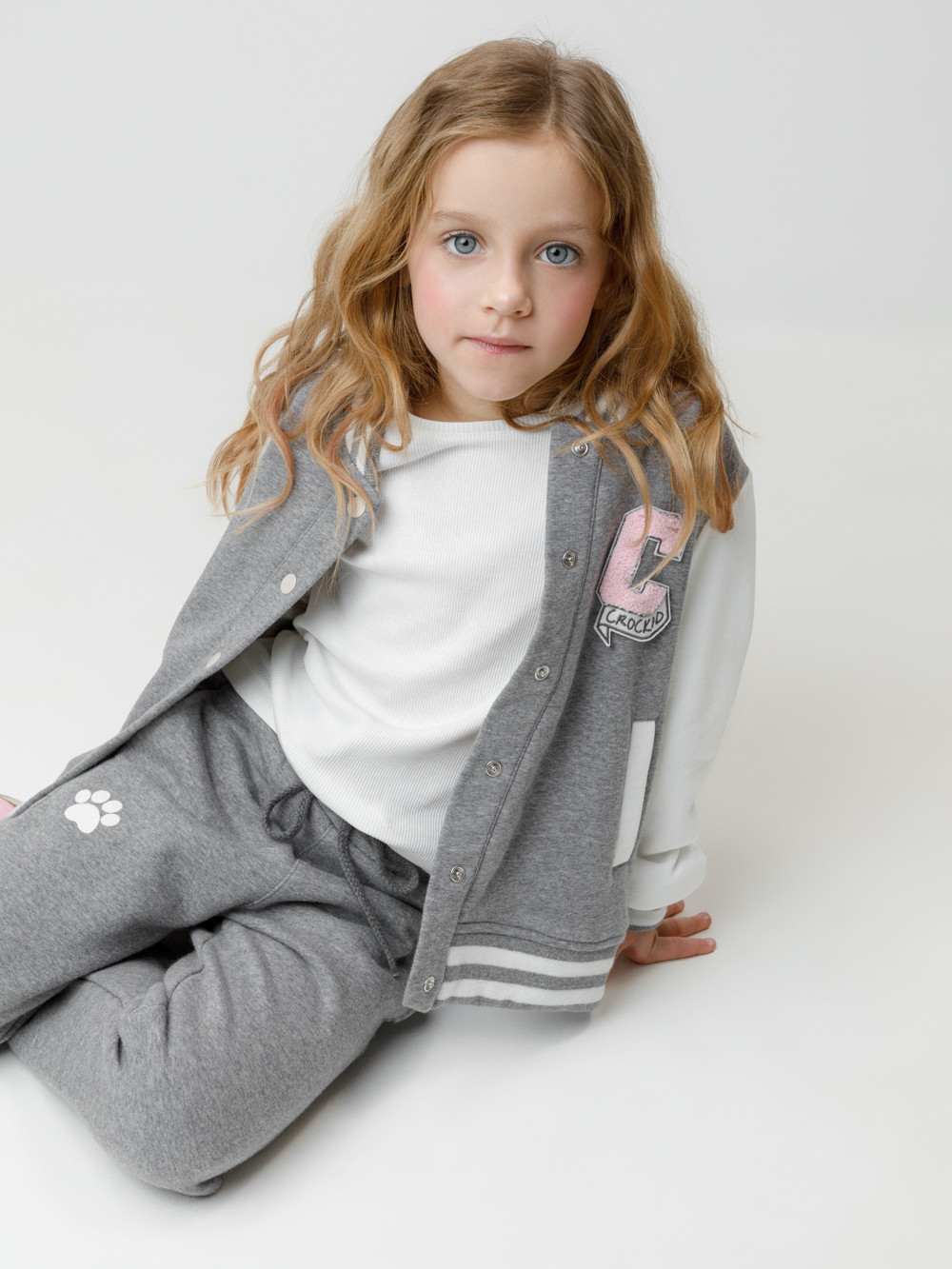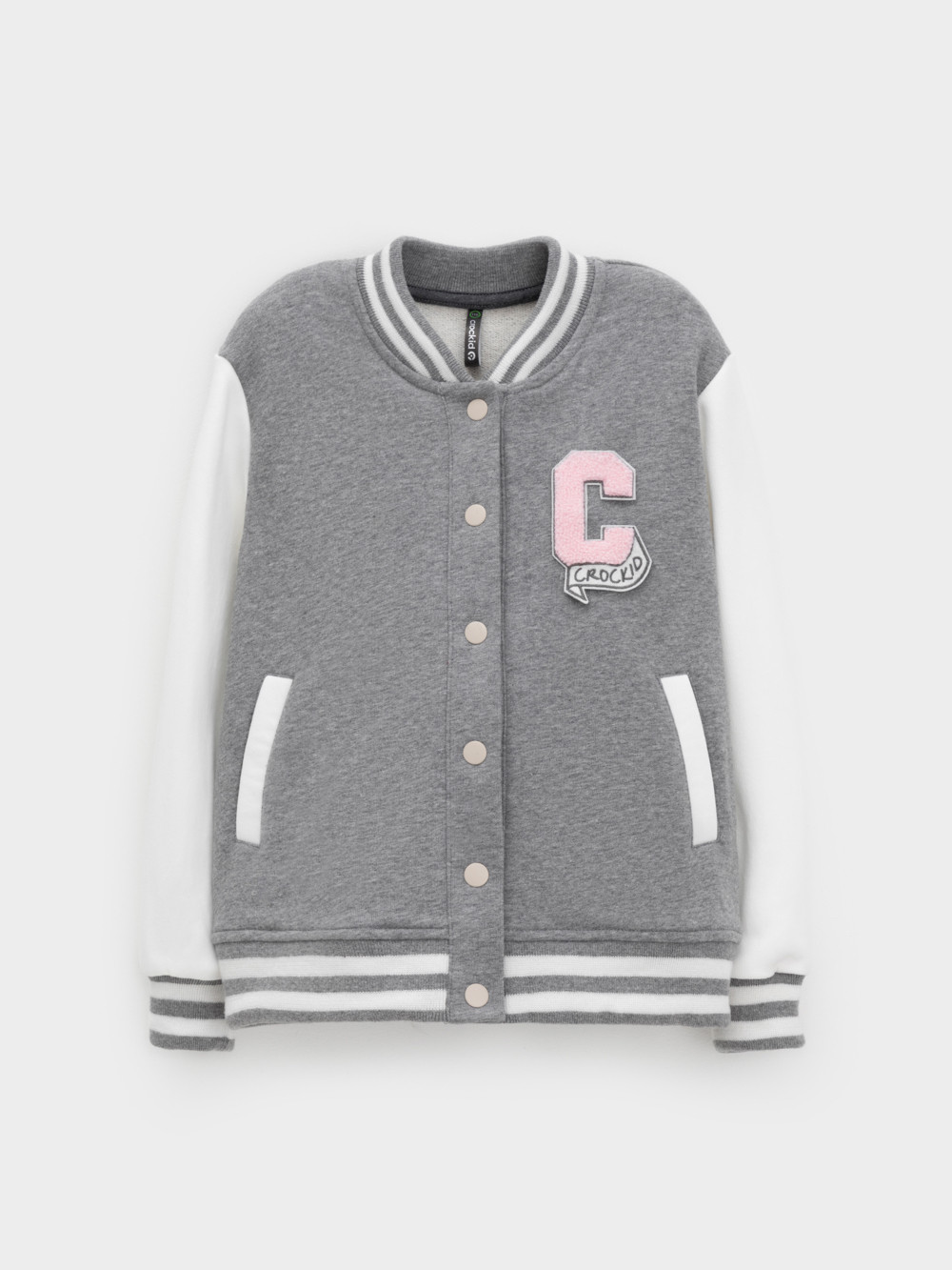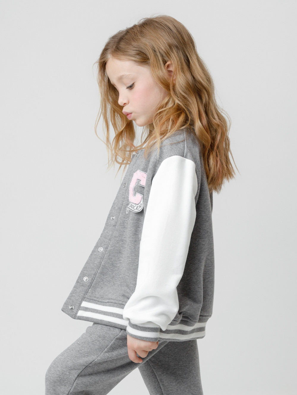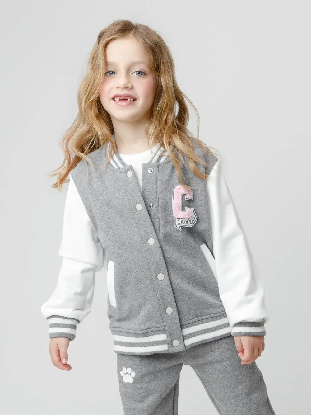 Бомбер для девочки с контрастными рукавами из мягкого трикотажа. В составе 80% натурального хлопка и 20% полиэстера, при этом полиэстер ввязан внутрь по особой технологии и не соприкасается с кожей. Застёгивается на кнопки. Воротник, манжеты и пояс вязаные. Спереди два кармана. Изделие сохраняет цвет и форму после многократных стирок. Все трикотажные полотна производятся в соответствии с нормами швейцарского сертификата ЭкоТекс.