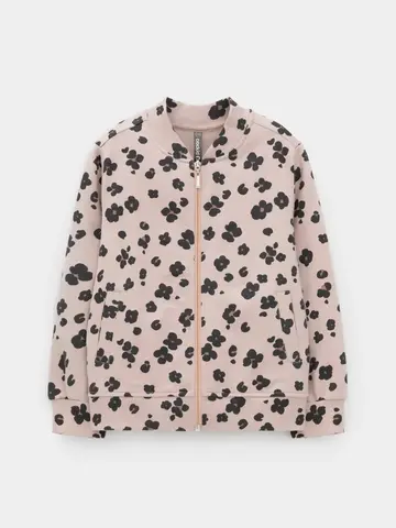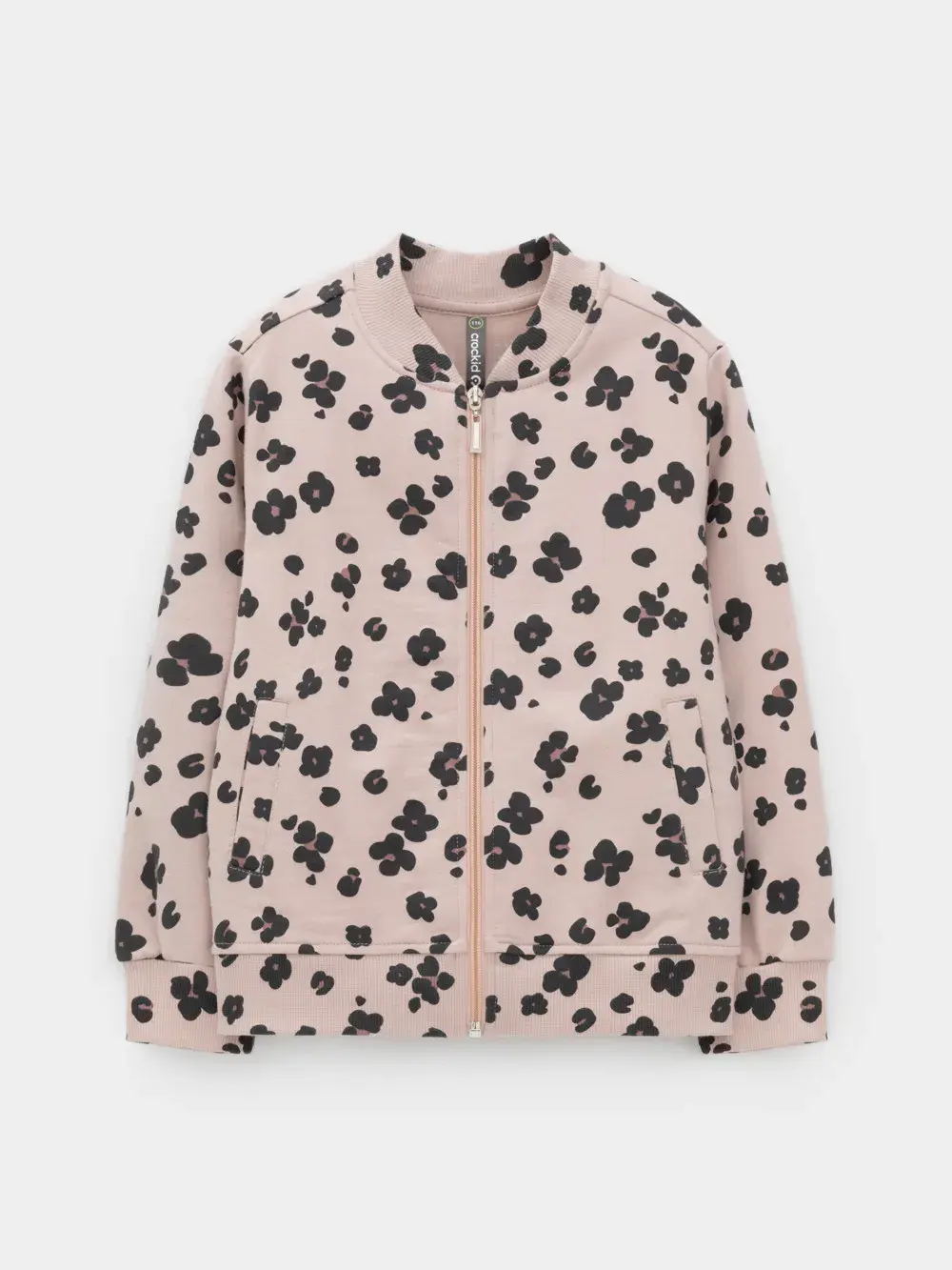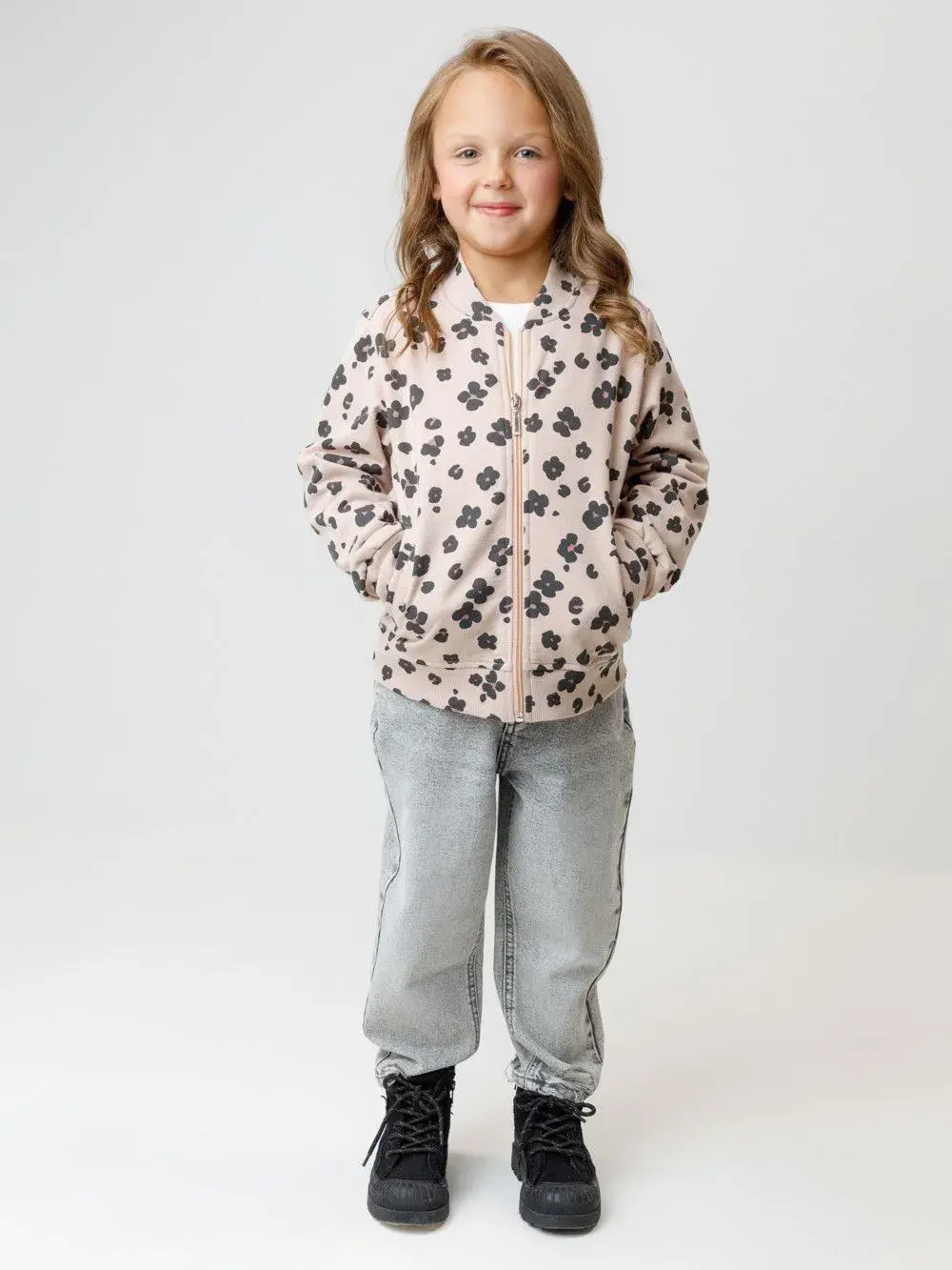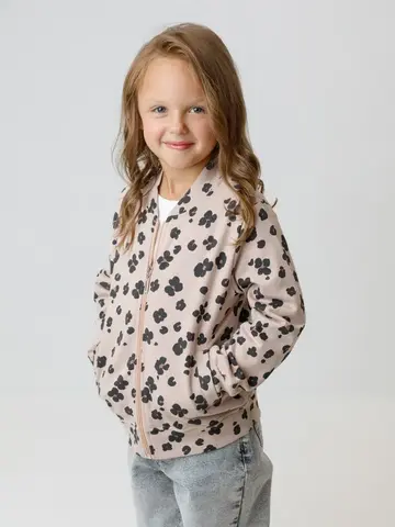 Мягкий бомбер на молнии для девочки. Изготовлен из высококачественного футера с начёсом. Воротник, манжеты и пояс выполнены из эластичного полотна. Оригинальный рисунок выполнен из стойких текстильных красителей. Бомбер сохраняет форму и стойкий цвет после многочисленных стирок. Все трикотажные полотна производятся в соответствии с нормами швейцарского сертификата ЭкоТекс.