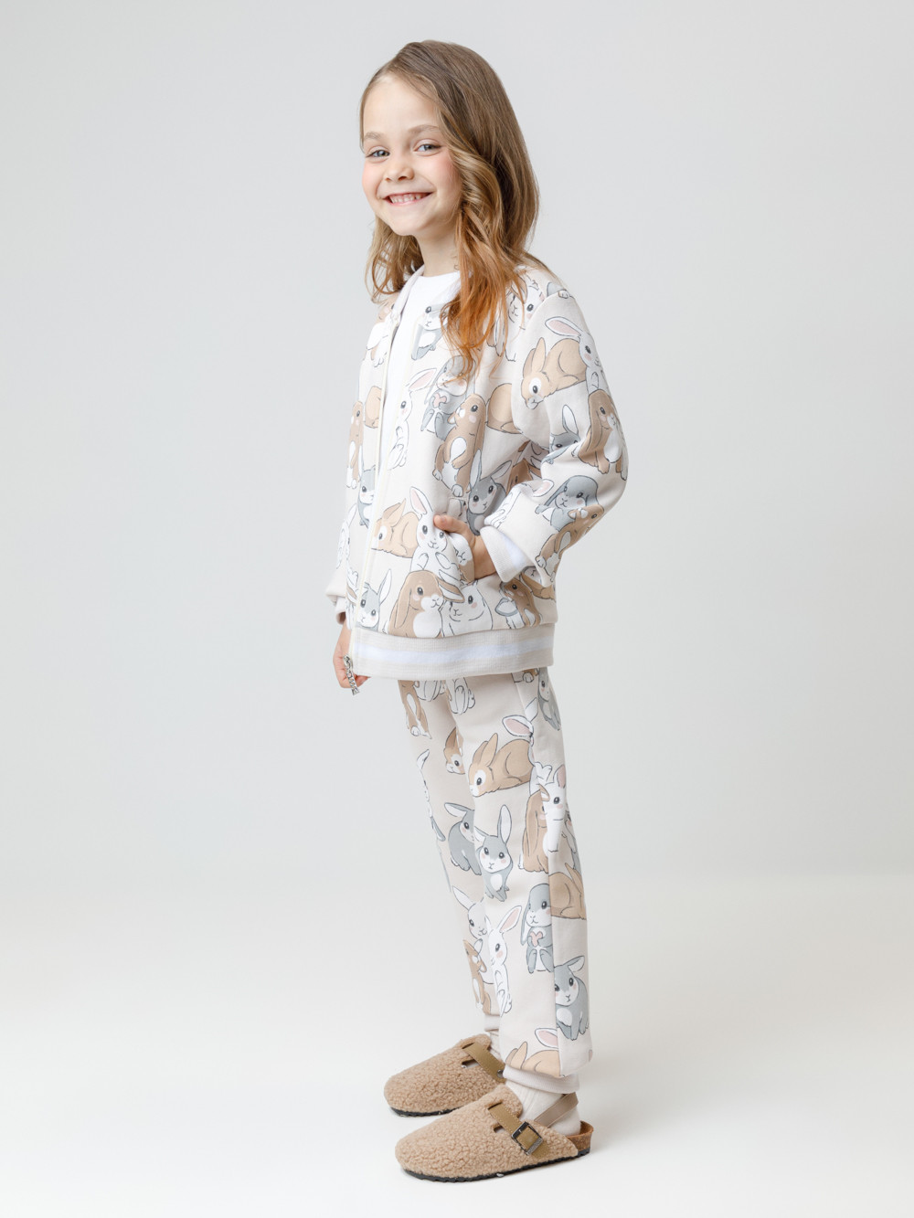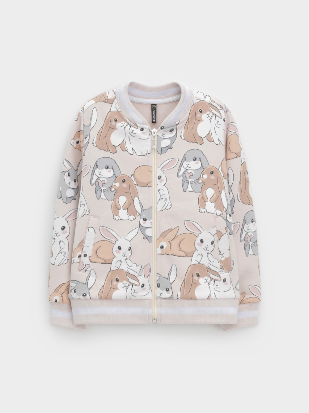 Мягкий бомбер на молнии для девочки. Изготовлен из высококачественного футера с начёсом. Воротник, манжеты и пояс выполнены вязаные. Оригинальный рисунок выполнен из стойких текстильных красителей. Бомбер сохраняет форму и стойкий цвет после многочисленных стирок. Все трикотажные полотна производятся в соответствии с нормами швейцарского сертификата ЭкоТекс.