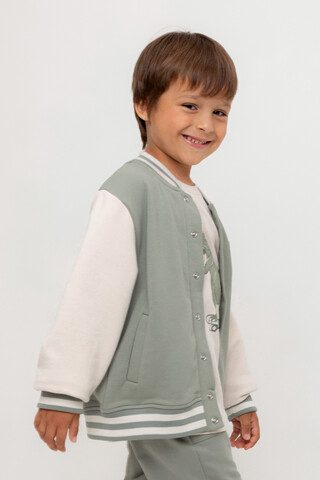 Бомбер с контрастными рукавами для мальчика. Изготовлен из мягкого петельчатого трикотажа. Застёгивается на кнопки. Воротник, манжеты и пояс - вязаные. Спереди карманы с листочкой.
