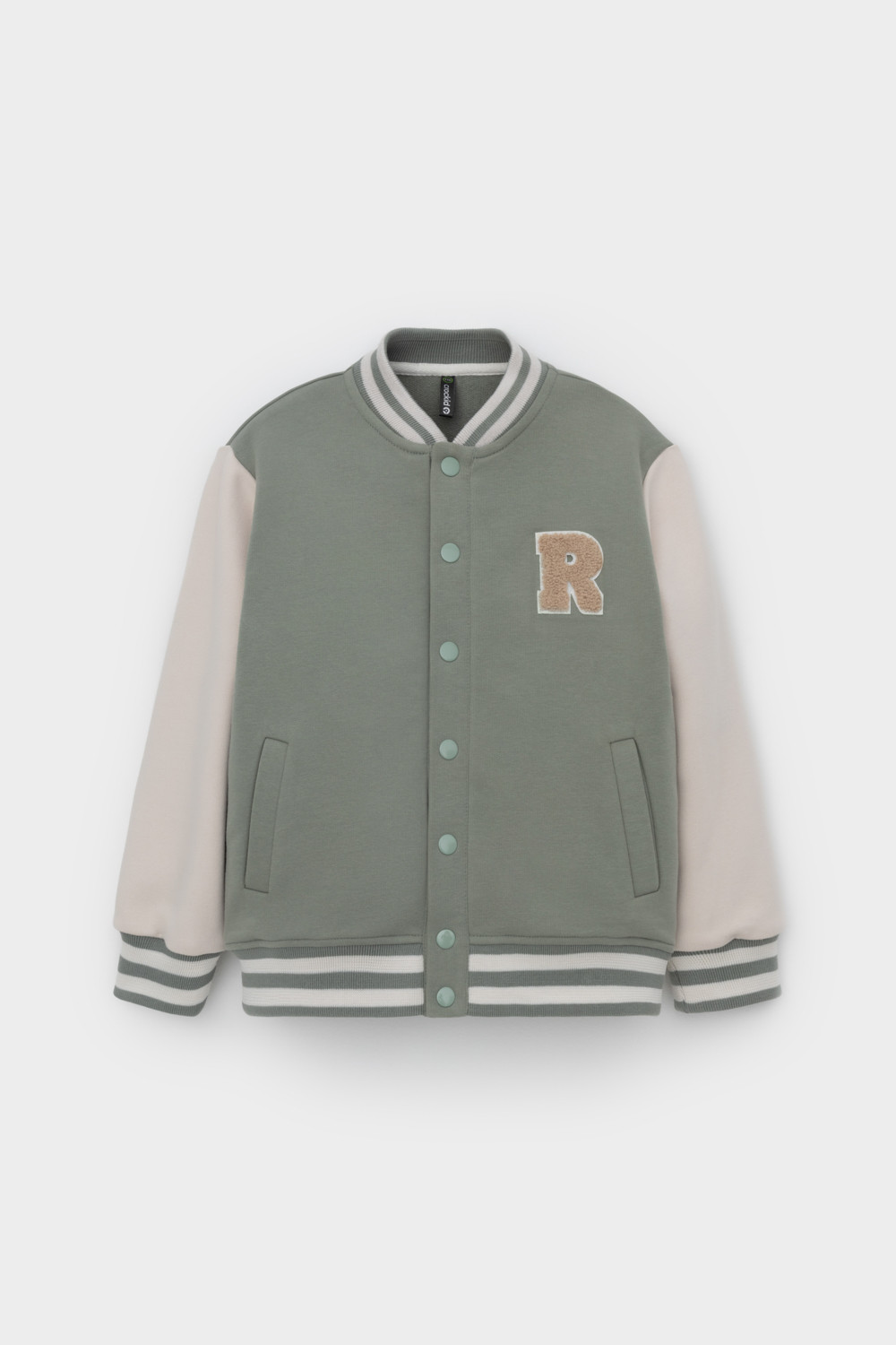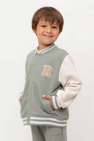 Бомбер с контрастными рукавами для мальчика. Изготовлен из мягкого петельчатого трикотажа. Застёгивается на кнопки. Воротник, манжеты и пояс - вязаные. Спереди карманы с листочкой.