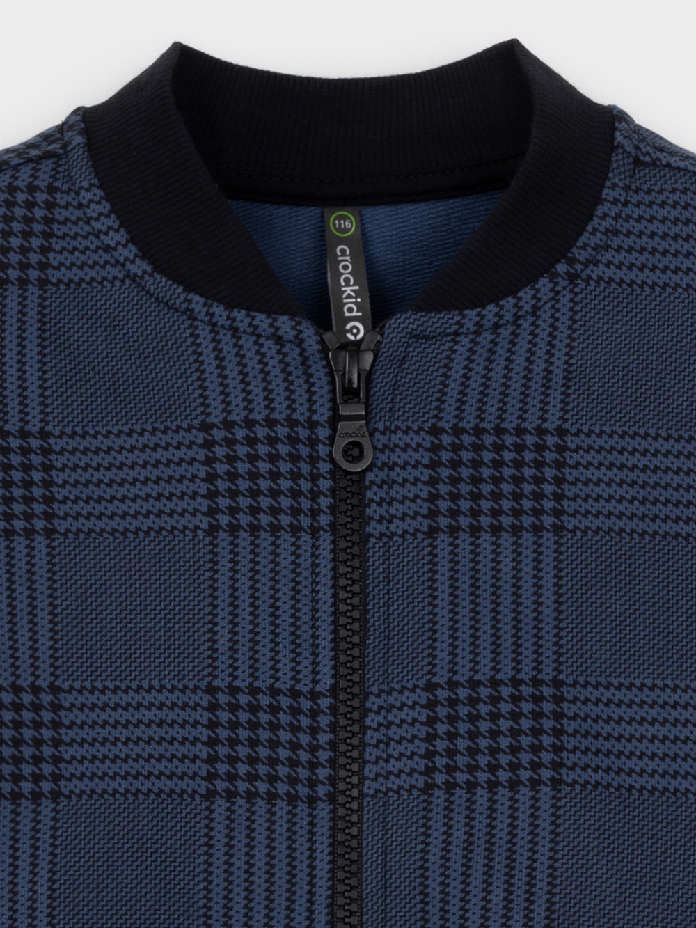 Бомбер для мальчика из мягкого трикотажа. Застёгивается на молнию. Воротник, манжеты и пояс -из эластичного трикотажа в рубчик. Спереди карманы с листочкой.