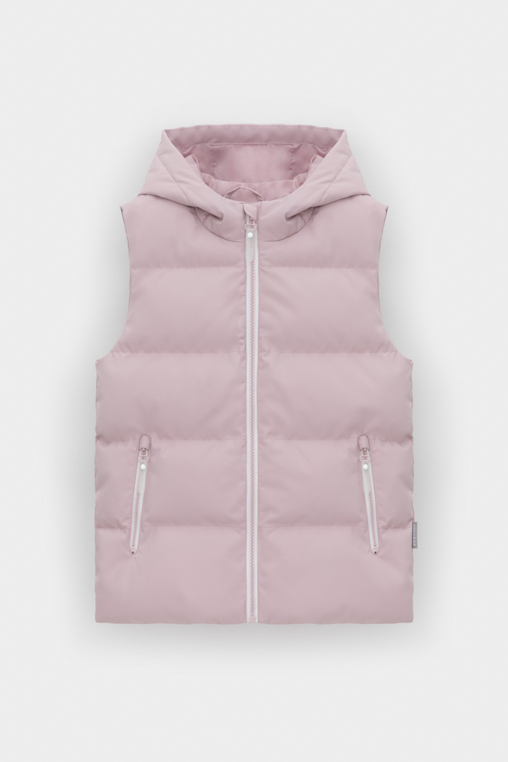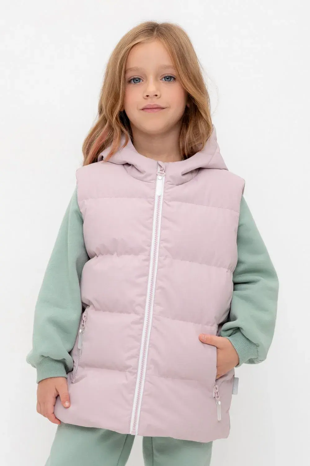 Стеганый жилет с капюшоном для девочки с утеплителем Fellex®: 120 г/м2. Выполнен из мембранной ткани с дополнительной тефлоновой обработкой. Данный вид обработки предохраняет изделие от загрязнения и лучше отводит влагу. Подклад из 100% полиэстра. Капюшон не снимается. Изделие застёгивается на молнию, предусмотрена защита подбородка. Два кармана по бокам застёгиваются на молнии. Во всех изделиях верхнего ассортимента для безопасности ребенка предусмотрены светоотражающие элементы.