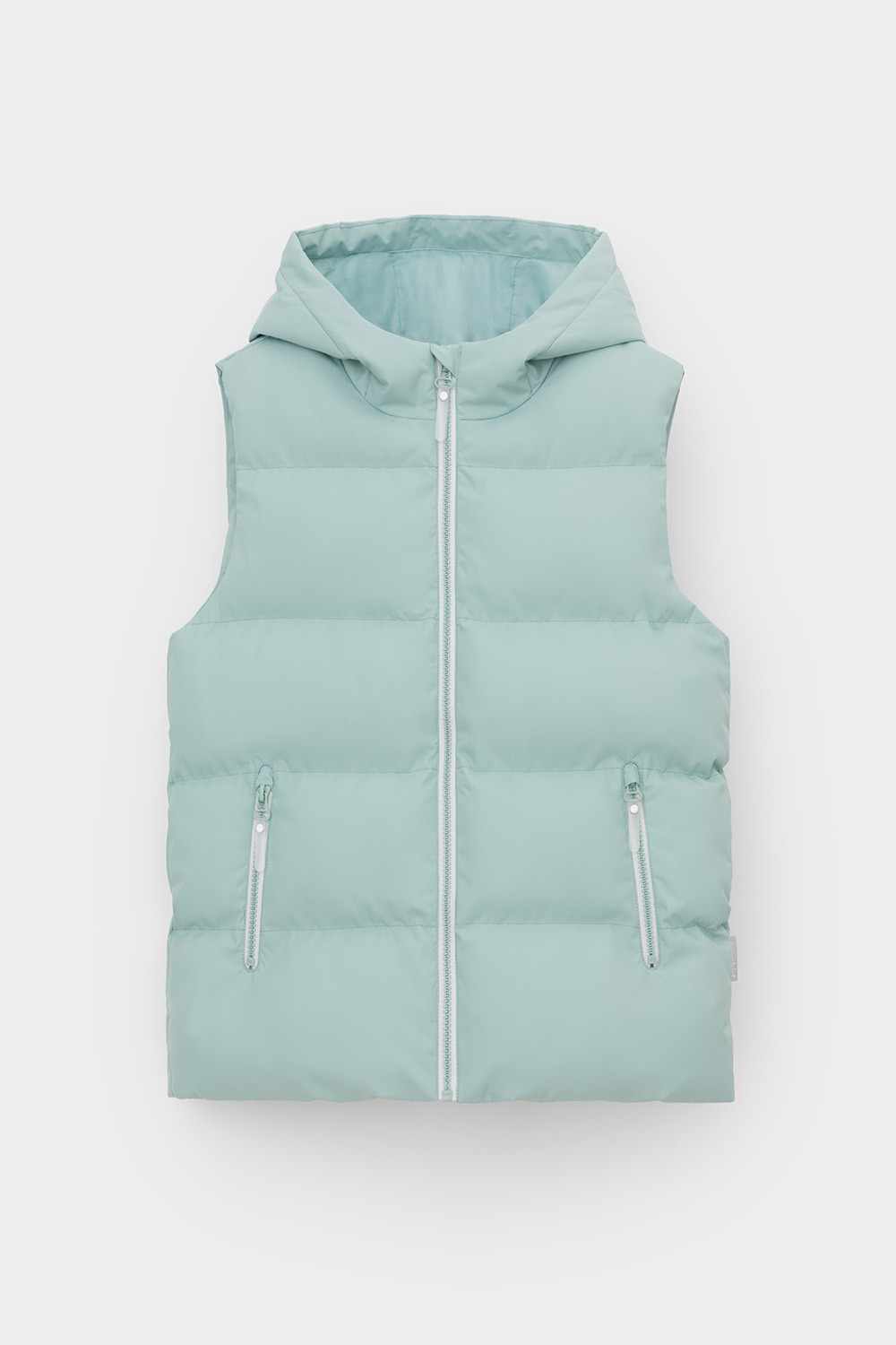 Стеганый жилет с капюшоном для девочки с утеплителем Fellex®: 120 г/м2. Выполнен из мембранной ткани с дополнительной тефлоновой обработкой. Данный вид обработки предохраняет изделие от загрязнения и лучше отводит влагу. Подклад из 100% полиэстра. Капюшон не снимается. Изделие застёгивается на молнию, предусмотрена защита подбородка. Два кармана по бокам застёгиваются на молнии. Во всех изделиях верхнего ассортимента для безопасности ребенка предусмотрены светоотражающие элементы.