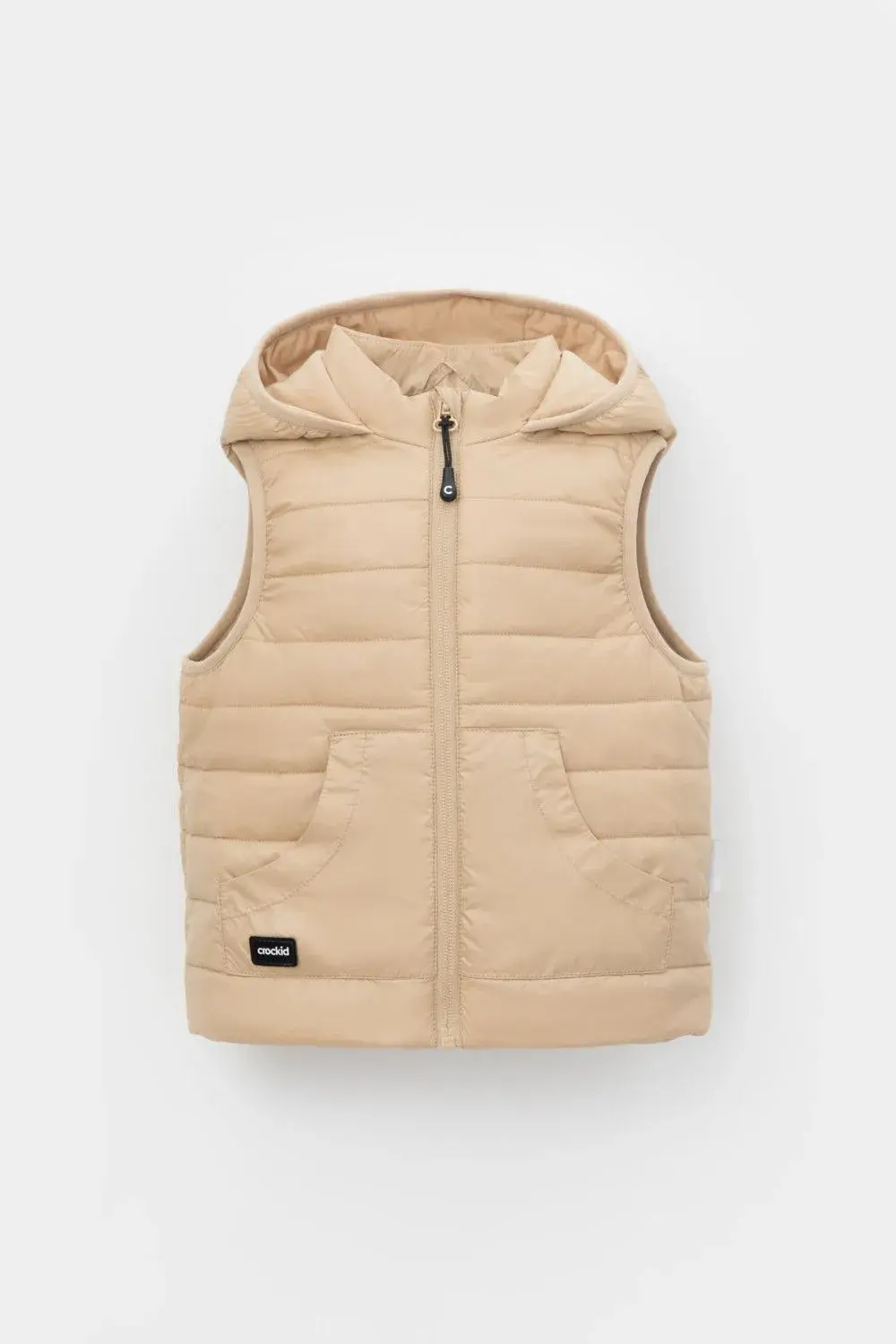 Стеганный жилет с капюшоном для мальчика с утеплителем Fellex®: 120 г/м2. Выполнен из мембранной ткани с дополнительной тефлоновой обработкой. Данный вид обработки предохраняет изделие от загрязнения и лучше отводит влагу. Подклад из 60% хлопка и 40% полиэстера в размерах 86-92, 92-98 и из 100% полиэстера в размерах от 98-104 до 122-128. У изделия предусмотрена защита подбородка. Несъемный капюшон имеет эластичную резинку для лучшего прилегания. Во всех изделиях верхнего ассортимента для безопасности ребенка предусмотрены светоотражающие элементы.