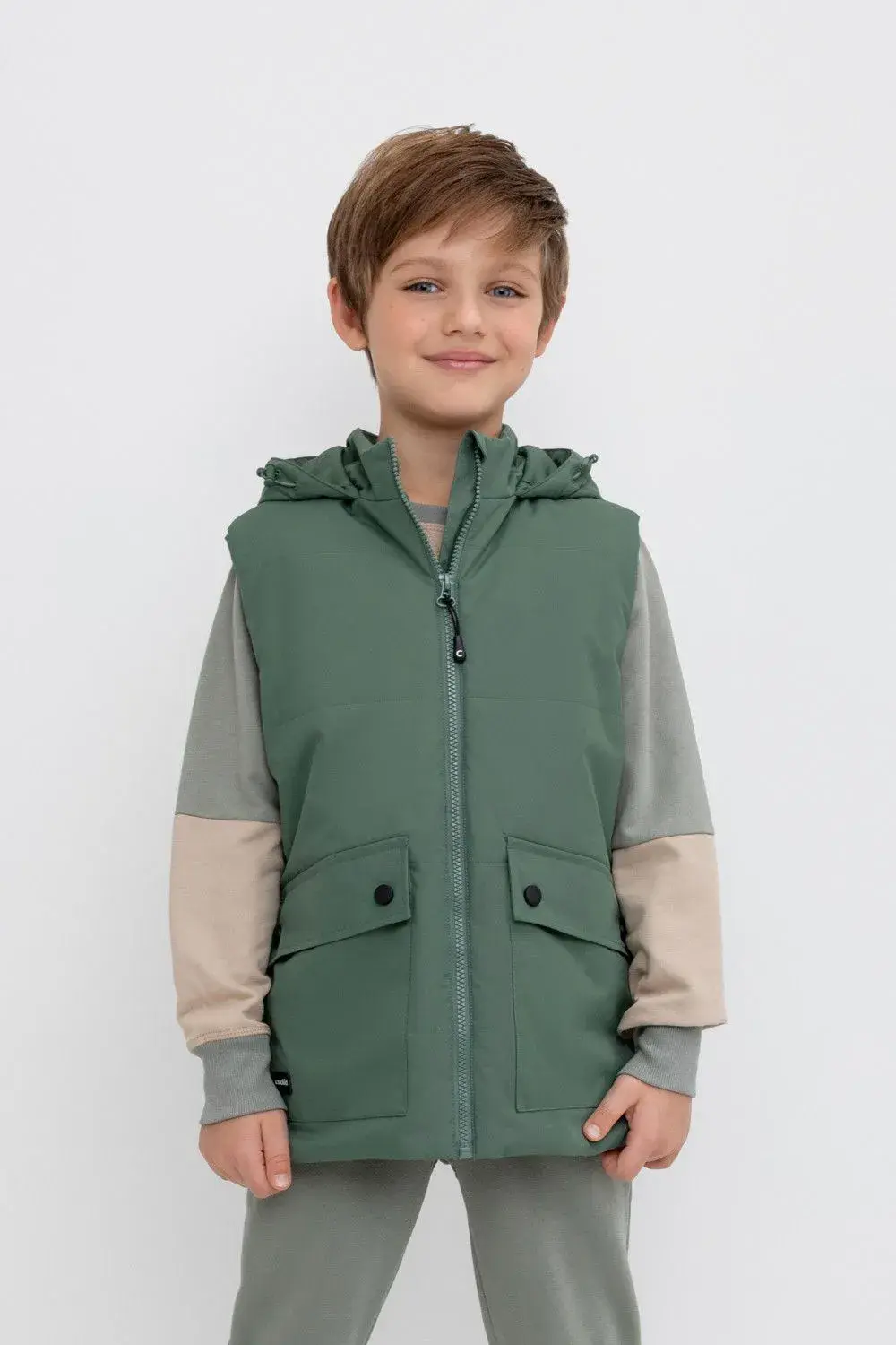 Стеганный жилет с капюшоном для мальчика с утеплителем Fellex®: 120 г/м2. Выполнен из мембранной ткани с дополнительной тефлоновой обработкой и матовым покрытием. Данный вид обработки предохраняет изделие от загрязнения и лучше отводит влагу. Подклад из 100% полиэстра. У изделия предусмотрена защита подбородка. Накладные карманы с клапанами на кнопках. Во всех изделиях верхнего ассортимента для безопасности ребенка предусмотрены светоотражающие элементы.