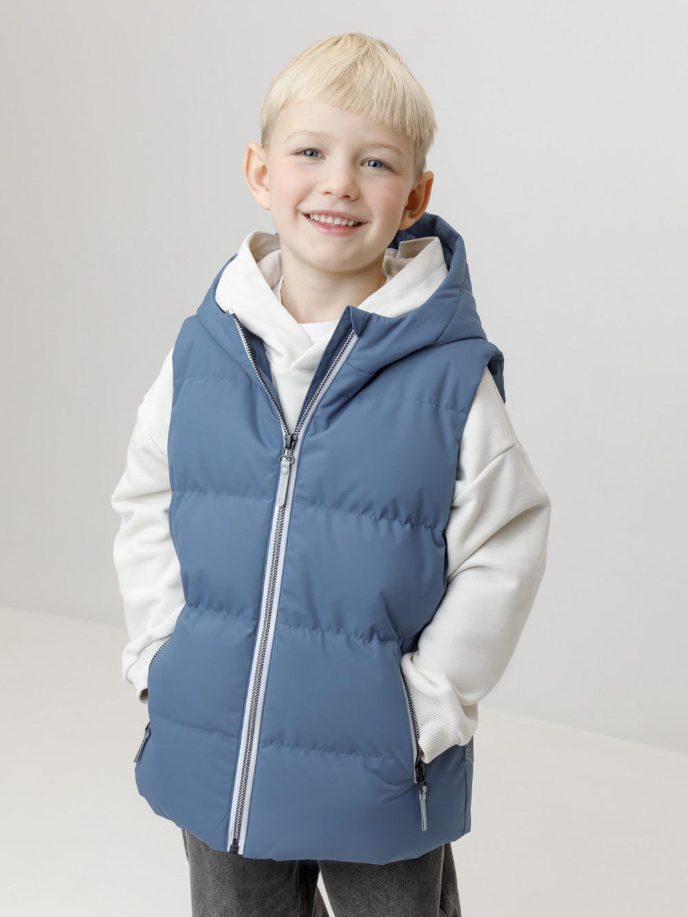 Стёганый жилет с капюшоном для мальчика с утеплителем, 120 г/м2. Выполнен из мембранной ткани с дополнительной тефлоновой обработкой. Данный вид обработки предохраняет изделие от загрязнения и лучше отводит влагу. Подклад из 100% полиэстра. Капюшон не снимается. Изделие застёгивается на молнию, предусмотрена защита подбородка. Два кармана по бокам застёгиваются на молнии. Во всех изделиях верхнего ассортимента для безопасности ребёнка предусмотрены светоотражающие элементы.